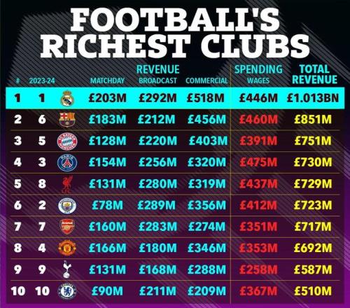 而且,因为英超和欧洲其他豪门的收入增长迅猛,曾10次排名收入榜首的曼联只能下滑,在德勤排行榜创立29年来首次无缘前五。本赛季,曼联不仅无缘欧冠,而且国内两项杯赛均「一轮游」,这赛季只有20个主场比赛,收入可能因此减少8500万英镑!